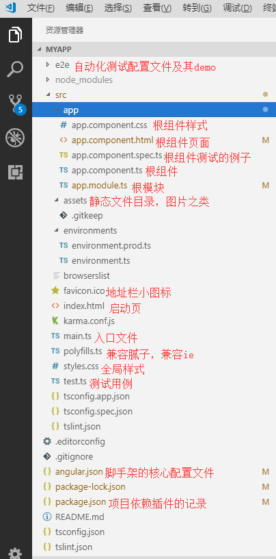 在 Angular6 以前,该文件名为.angular.json,Angular6 改成了angular.json,少了一个小数点,这个文件是脚手架的核心配置文件。