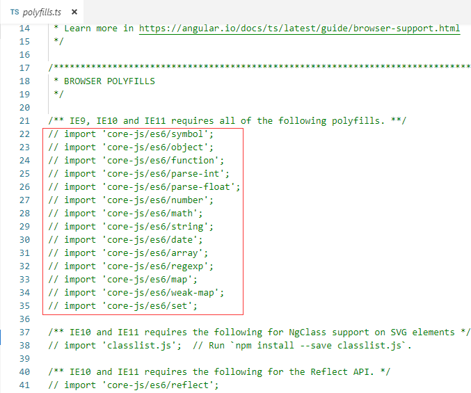 这个文件叫做腻子脚本,Angular 是默认对 ie浏览器 是不支持的,即新建项目后,在 ie浏览器 的本地4200端口页面是一片空白,将以下的注释取消,在ie浏览器中可以看到页面。