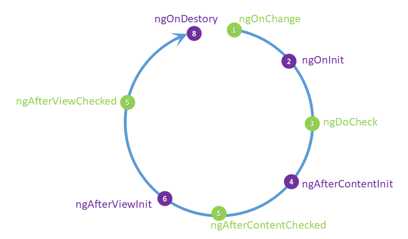 如图所示,Angular 组件的生命周期钩子执行顺序从图中的1到8,但没有一个组件或指令会实现全部的生命周期钩子。