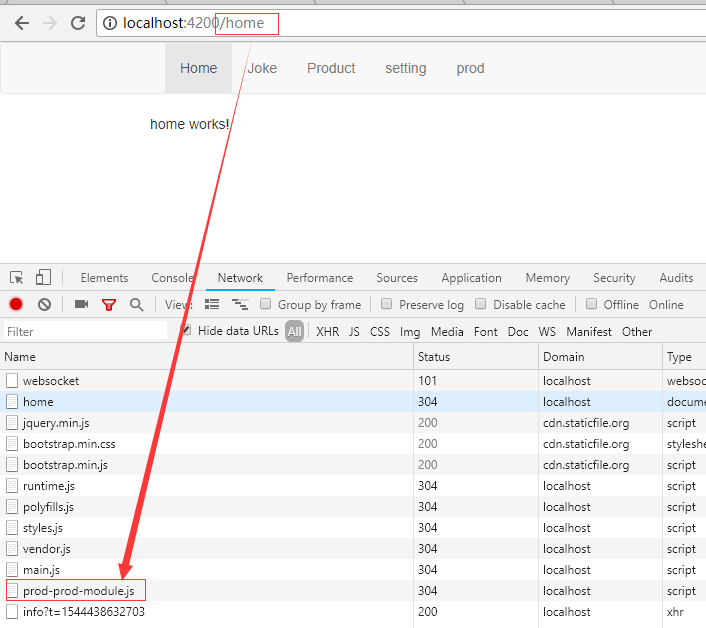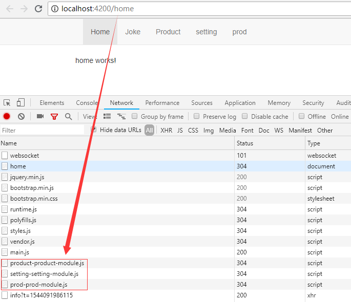 在 app-routing.module.ts 文件中,加载模块的模式是 懒加载 模式,但是由于使用了 预加载,从上图中可以看到在 home 路由时,项目加载了对应 prod 路由下的 prod-prod-module.js 文件,说明 Angular 自带的预加载策略使用成功。